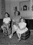 Mrs. Geraldine Malloy (Mrs. John F. Malloy) and children, John G. "Jackie", 8, and Peggy, 4, have returned to their home in Oklahoma City after with her parents, Mr. and Mrs. Robert and Bertha Goodrich, at 3721 Monticello Drive. Published in Fort Worth Star-Telegram morning edition, July 16, 1950. A woman, a little girl and boy all three sitting in chairs. Smiling and dressed formally.