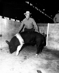 Texas Boar Wins - Larry N. Tackitt of Happy poses his fall boar, named Champion over entries from 11 other states at the Southwestern Hampshire Meat- Hog Conference.