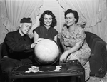 Henry S. Layton, left, and Miss Latryl Layton, center, show their mother, Mrs. H. E. Layton, 2215 Columbus, how far they will be from home. Henry and his sister both left together. Henry for the National Boy Scout Jamboree at Valley Forge, Pennsylvlia, and Miss Layton for Campus-in-the-Woods at Huntsville, Ontario, Canada, to attend the Christian Inter-Varsity Fellowship Encampment. Two woman and a man in a uniform and woman wearing dresses. They are center down with a plastic globe of the Earth looking at it together. Published in Fort Worth Star-Telegram morning edition, June 26, 1950.