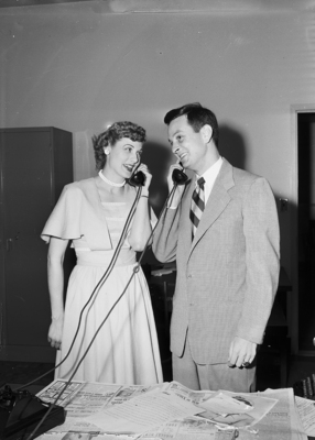 Flo Kelly, Telephone operator at J. E. Foster & Son, got the right number when she called K. L. Kirkpatrick of Southwestern Bell Telephone Company to invite him to the Communication Club's "Sweetheart Banquet". A man and a woman dressed formally on the phone standing next to each other smiling. Published in Fort Worth Star-Telegram morning edition, June 24, 1950.