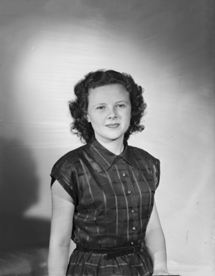 Miss Ann Wright, daughter of Mr. and Mrs. W. C. and Wilma Wright, 2737 Avenue G, and Billy Maines, son of Mr. and Mrs. W. T. Maines. Route 12 were married in the Oaklawn Baptist Church by Reverend E. R. Stiles. A woman standing up in a dark blouse smiling forward. Published in Fort Worth Star-Telegram morning edition, June 24, 1950.