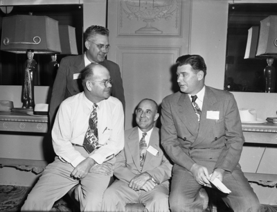 At the Texas Butane Dealers Association meeting, where an industrywide advertising drive is planned, were William J. Lawson of Austin, rear, and seated, left to right, Lyle David Blanton of Hereford, W. R. McCright of Victoria, president, and Gene Bumpus of Plainview. Published in Fort Worth Star-Telegram evening edition, June 23, 1950. Four men sitting and standing up talking and laughing.