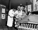 Tommy Scheiffer, 2 (front and center) and his pal, Johnny La Hue, 3, drop in at Tommy Tatum's filling station for autographs from Tatum, Bobby Bragan and Mel Waters (back row, left to right). The Cats helped Tom open the place. Published in Fort Worth Star-Telegram morning edition, June 24, 1950. Three men and two little boy. Published in Fort Worth Star-Telegram morning edition, June 24, 1950.