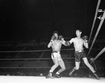 Milford Ballard lands a blow to the chin of Mike Martinez in an open welterweight bout Saturday night in the regional Golden Gloves tournament at Will Rogers Memorial Coliseum. Martinez won the bout on a decision. Action in the tournament will resume at 7 p. m. Monday night.