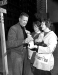 Warren Connelley was a willing contributor for Karen Hiett, 17, center, and Terry Haun, 16, who did their bit Saturday for the fourth annual Blue Crutch Teen Day of the March of Dimes.
