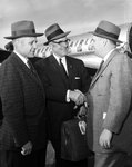 Lions Leader Greeted - Roy Keaton, center, director general of Lions International, greeted by two Fort Worth men on his arrival at Amon Carter Field Monday afternoon from Chicago. He was then taken to Wichita Falls, where he will address the District Mid- Winter Conference of Lions Tuesday. Fort Worth men are Dr. Richard A. Self, past-international director, left, and Marvin B. Simpson Jr., district governor.