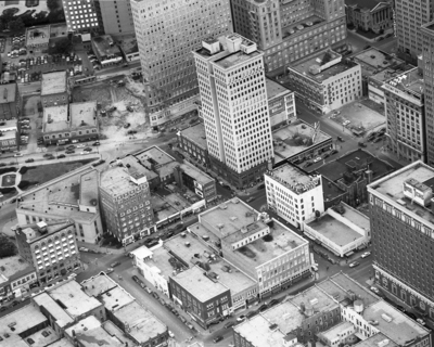 Aerial view showing sites for Skyscraper office and Bank Building and parking garage. Published in Fort Worth Star-Telegram evening edition, June 24, 1950.