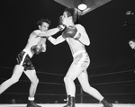 Richard Taylor, left, of Arlington Heights takes a right to the jaw but throws one of his own that connects to the face of Arlington's Eugene Stribling during their high school lightweight battle Monday night at Will Rogers Coliseum. Taylor was the winner on a decision.