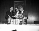 For Science Shelves - Paul Dearmin, center, program chairman for Rotary Club of Western Fort Worth, presents a collection of books on science and natural history from the club to principals of two junior high schools. They are Weldon Lucas of Stripling, left, and Ree Bostick of Moning.
