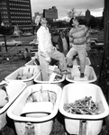 Bathtub Gallery - Workmen demolishing the Hickman Hotel at W. 6th and Burnet stand in removed bathtubs to watch and help. They are, front, left to right, Daniel Garsa and Sid Sodia, and back, center, C. Luna. The site will become a parking lot for the new First National Bank.