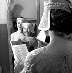 Mrs. Wanda Cantrell and Miss Gigi Allison, a TCU sophmore, with powder puff, both members of the chorus, prepare for the opening curtain of "The Magic Flute" Wednesday night. The production will be repeated Friday night by the Fort Worth's Opera Association.