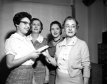 Miss Sharon Pendergrass, left, receiving a check from Mrs. W. B. Sanderson, right, with Mrs. Dorothy Mueller second from left, and Miss Mattie Lou Clinton, looking on. The recipient will use the check from the Fort Worth chapter, American Business Women's Association to attend TWC.