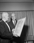 Dr. William J. Danforth, vice chairman of the Chamber of Commerce military affairs committee was honored by Carswell Air Force Base Friday night for his long services. In the picture, Brig. Gen. Nils O. Ohman, left, presenting the scroll to Dr. William J. Danforth.