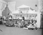 Three sisters, Kitty, left, Suzie, center, and Laurie Pannell, daughters of Mr. and Mrs. W. C. Pannell, 6108 Sharon, display the doll house, complete with wall-to-wall carpeting, a bird in a cage, and miniature kitchen utensils, which they "play house" with every day.