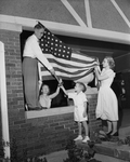 Hanging the Stars and Stripes for Fourth of July is a tradition with the Byron Patties, 2502 Lipscomb. Preston hands the hammer to Mr. Pattie as daughter, Ilene, and Mrs. Pattie supervise. Published in Fort Worth Star-Telegram, morning edition July 2, 1950.