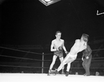 Stanley Cremer of Arlington appears to be defying the law of gravity as he goes down after taking a whistling left from Castleberry's Ronnie Russell in the second round of their high school flyweight semifinals bout Friday night. Russell advanced to the finals, via decision.