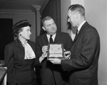 W. A. (Doc) Ruhmann was honored with an appreciation luncheon at a meeting of the Fort Worth Farm and Ranch Club at Hotel Texas. Ruhmann has moved to Houston to enter private business after serving as radio Tv farm director at WBAP, the Star-Telegram station for eight years. in the picture, W. A. (Doc) Ruhman, center, Mrs. Ruhmann, left, and Gene Bales, right.