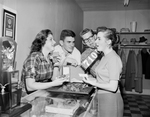 Four junior achievers talk over their products at a recent meeting. They are, left to right, Gloria Selleh, 17, of Our Lady of Victory Catholic School (OLV); David Banner, 17, of Poly; Joe Loe, 16, of Handley, and Sarah Junkins, 18, of Tech.