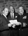 The Cold War, said Rear Adm. Walter G. Schindler, commandant of the 8th Naval District, is like the flip of a coin with Russia flipping the coin. Schindler spoke at the annual Navy League dinner at Ridglea Country Club. In the picture, left to right, William T. Green, Sid Rochelle, and Rear Adm. Walter G. Schindler.