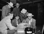 Stock Show. Ranch & Farm Show. Pete Baker, explains new welding machine to D. C. Tyler, John L. Frank and F. L. Pierson.
