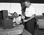 Bill Bonnell, left, gets a can of coffee from Charles Prior, president of the Fort Worth Radio Active Amateur Club, at Inspiration Point. Bonnell stayed at the point 24 hours during national emergency field day. Published in Fort Worth Star-Telegram, morning edition June 26, 1950.