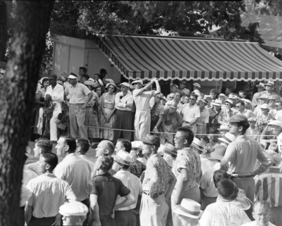 Crowd watches winner Ben Hogan drive from the 10th tee at the National Invitation Tournament, Colonial Country Club, Fort Worth; at left is Doug Ford who tied for second place.