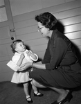 Mrs. W. H. Knight, project chairman for Fort Worth Delta Zeta Alumnae, presented the sorority alumnae's group's check for the Speech, Hearing, and Intellectual Disabilities Clinic of TCU to Mariann Rutherford daughter of Mr. and Mrs. H. L. Rutherford.