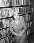 One of the most enthusiastic conversationalists and boosters for the North Side is Miss Gladys Ankerson, who knows the history and all about the "old families" of the area and how it grew. A woman is sitting in front of a shelf full of books.