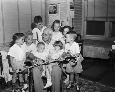 Floyd H. Herring was a great favorite when his great-great-grandchildren dropped in to help celebrate his 81st birthday. On his lap are Jaymes Burr, left, and June Ann Mendenhall. Standing behind, left to right, Phil Headland, Harry Burr III, Edwin Cox Jr., Elizabeth Sue Headland, Cheryl Ann Cox and Leslie W. Mendenhall III. A ninth great-great-grandchild was present but did not get in the picture. A old man and children wearing white polos and pants. Published in Fort Worth Star-Telegram morning edition, June 26, 1950.