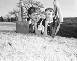 Pam Lankton, left, and Carol Stanley are among the Camp Fire Girls who will plant a dogwood trail in the Botanic Gardens February 14. Ten Camp Fire groups will participate in the planting, a part of the organization's Golden Jubilee project. Two girls are outside, lying on the grass while holding shovels.