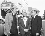Fifty boosters for more travel on U. S. Highway 287 visited Fort Worth at noon Thursday, had lunch while their caravan of 17 motor vehicles were parked in a reserved area at Hotel Texas and then headed for Palestine, where they spent Thursday night. Left to right is, Willard Murffin, S. W. Vogel, and Charles A. Stewart. Three men stand in front of automobiles.
