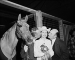 Stock Show. Horses. Cissy Crumley with father Frank Crumley and Fred Hodge, after winning Palomino pleasure stake.