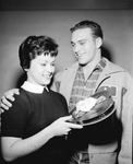 Jerry Jack Terrell recently elected Valentine king at Amon Carter Riverside High, presents a box of candy to Glenda Yeargan, who was chosen as queen.