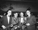 The Gene Hall Orchestra from North Texas State College at Denton was named the "Best New Band of 1959" of the Fort Worth area in competition Sunday with three other 15-piece groups. Left to right is, Gene Hall, Doug Hazlewood, Frank Kasko, and Danny Burke. Hall, Kasko, and Burke are holding saxophones. Hazlewood is holding a trumbone.