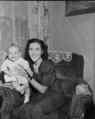 Mrs. Oliver T. Maxwell III of San Angelo and 6-month-old son, Oliver T. Maxwell IV, are spending their vacation with Mr. Maxwell at the home of his mother, Mrs. O. T. Maxwell, 2737 Meadowbrook Drive. A woman holding up a baby who is standing on her lap. Published in Fort Worth Star-Telegram evening edition, June 30, 1950.