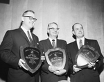 The Tarrant County United Fund elected Joseph H. Chowning new president at its annual dinner meeting in Hotel Texas Monday night. Chowning served as chairman of the 1958 campaign, He, Don Gamel, outgoing president, and Charles Ringler, public relations chairman for the drive, received bronze plaques for their UF work from Thomas H. Law, head of the annual meeting committee. Left to right is, Don Gamel, Joseph H. Chowning, and Charles Ringler.