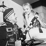 James W. Blair, 78, of Cedar Hill, exhibits the bagpipes he will play in Casa Manana's production of Brigadoon, the fantasy of a Scottish town that comes alive one day in 100 years. The lassie is Muriel Foran of Boston, who's in the chorus.