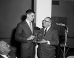 Award- Hunter Enis receives the Grassy Hinton award as the 1958 Frogs' " Most Conscientious Player" from L. R. (Dutch) Meyer at Tuesday night's banquet.