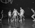 Aggie Arm- Texas Christian University's H. E. Kirchner appears to be taking elbow to the chin from Texas A & M's Jim McNichol during Wednesday's Southwest Conference basketball game. Watching at left is Aggies' Neil Swisher. Other players are Wilmer Cox of A& M (35) and Texas Christian University's Kenneth King (21). Frogs won important game, 80-61.
