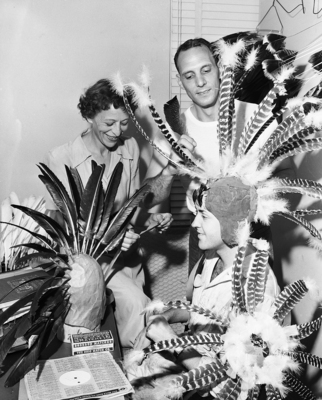 The TCU Fine Arts Building is almost filled with feathers. Headdress and costume designer got underway for the "Thunderbird," summer operetta to be staged late in July and early in August. Mrs. Rachel Moore, TCU accompanist, and David Preston, ballet instructor, directors of the show, use Dick Embelton, fine arts junior, as a model for an elaborate Native American headdress. Dick Embelton is sitting down while ballet instructor David Preston places feathers on his head piece. Mrs. Moore stands next to David Preston. Published in the Fort Worth Star-Telegram evening edition, June 29, 1950.
