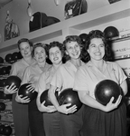 Winner of Class A team title in recent women's city bowling tournament was this Tackett Egss lineup of, left to right, Grace Fowler, Louise Elliston, Mary Clark, Jackie De Lap, and Lilla Lynch.
