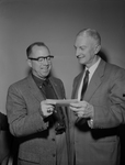 Bernard J. Lunt, right, 1958 chairman of the Fort Worth Chamber of Commerce continuous membership committee, the Wranglers, accepts from Marcus Reiners a gift of appreciation from the group Thursday night at Hotel Texas.