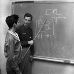 Walter Kovar, right, instructor in amateur radio classes at the Air Force Reserve Center, questions beginning student Vernon Crawford, 14 about the diagram of a crystal oscillator circuit.