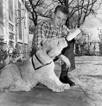 Carl (Butch ) Lemmon, junior at Amon Carter- Riverside High School, is baby -sitting or ree this 6 months old lion cub, Wilbur, owned by Ray Bridges of Dallas. Wilbur gets his formula, plus vitamins, just like any other baby.