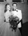 Miss Robin Campbell, daughter of Mr. and Mrs. Robert S. Campbell, receives a bouquet from Fred Riebe, master of ceremonies at the Valentine formal of the Fort Worth chapter, Order of De Molay. Miss Campbell was presented as queen at the ball, held Saturday night at the R. D. Evans Recreation Center.