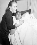 Joe Freeman, 21, a flagman who got his lumps Sunday in a Frostbite Race accident, loves sport car racing enought to give it a plug even from a hospital bed. In the picture Freeman and his wife.