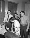 Armed Forces Recruiters donated blood for Mrs. L. M. Mayfield. On the table is Army Sgt. 1/C Nat Fralia. Waiting are, left to right, Air Force Tech Sgt. Herschel Hancock, Navy DC 1/C Robert Kuykendall and Marine Staff Sgt. William L. Spellins. The nurse is Mrs. Virginia Jacobs.