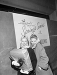Mrs. Benny Ray, left, and Mrs. Jerry Ogle are caught in snow while shopping Thursday, but window display holds promise. It could only happens in Texas from a sweltering 88 degrees on Tuesday to freezing rain and snow 48 hours later.