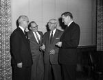J. E. McKinney, left, executive vice president of Fort Worth National Bank, and Estil Vance, right, president of the bank, greet G. Richard Crawley, second from left, president, First National Bank of Lamesa, and malcolm Meek, president, Citizens National Bank, Abilene.