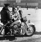 Fort Worth Motor Officer Norman Burns, a judge at bicycle "roadeo" Saturday on McLean Junior High parking lot, makes notes while Christy McDaniel, 12, attempts tricky "Twin circle" maneuver; sixth grade girl scouts of Bluebonnet Elementary School participated.